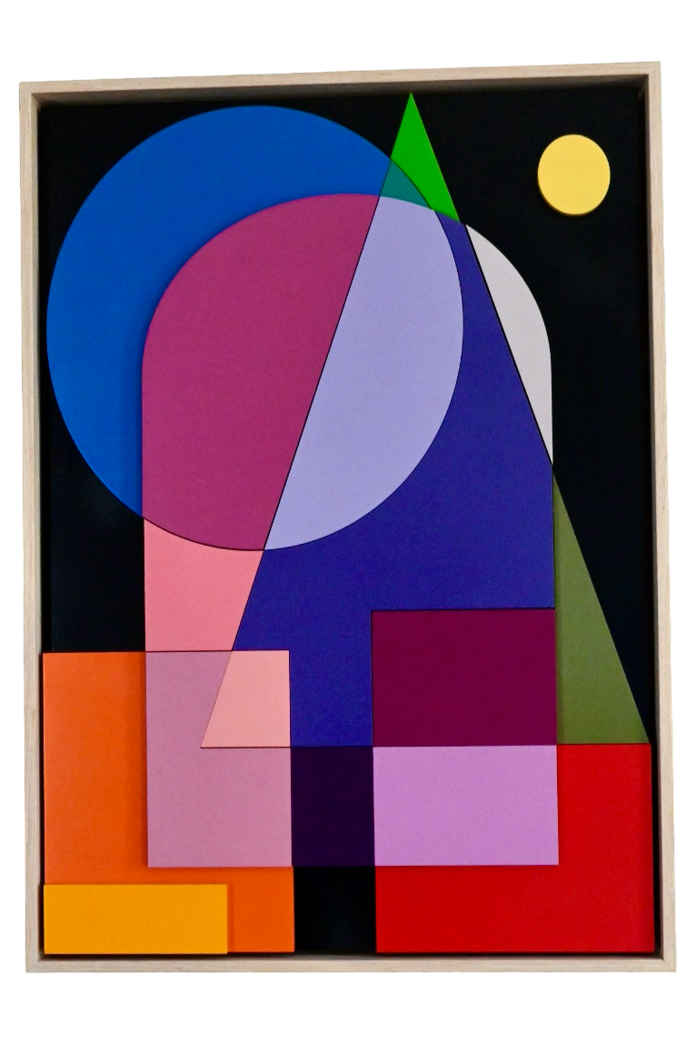 The title Lunára, is a modern take on the Irish word for moon. Inspired by Irish folklore, my work and this piece, blends colour, shape, and light into a dreamlike harmony. Circles, triangles, and squares overlap, forming abstract alignments that suggest portals to another world. As the day becomes night, this piece dances with light, offering new perspectives as the hours pass. The work balances structure with fluidity, reflecting how night veils the world in imagination.